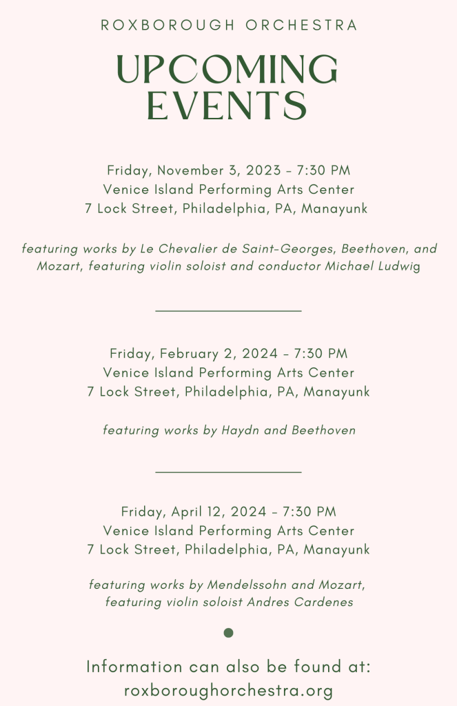 *Followed by dining and refreshment at Bourbon Blue. Bourbon Blue has generously offered 15% off food for audience members and Roxborough Orchestra Musicians.*